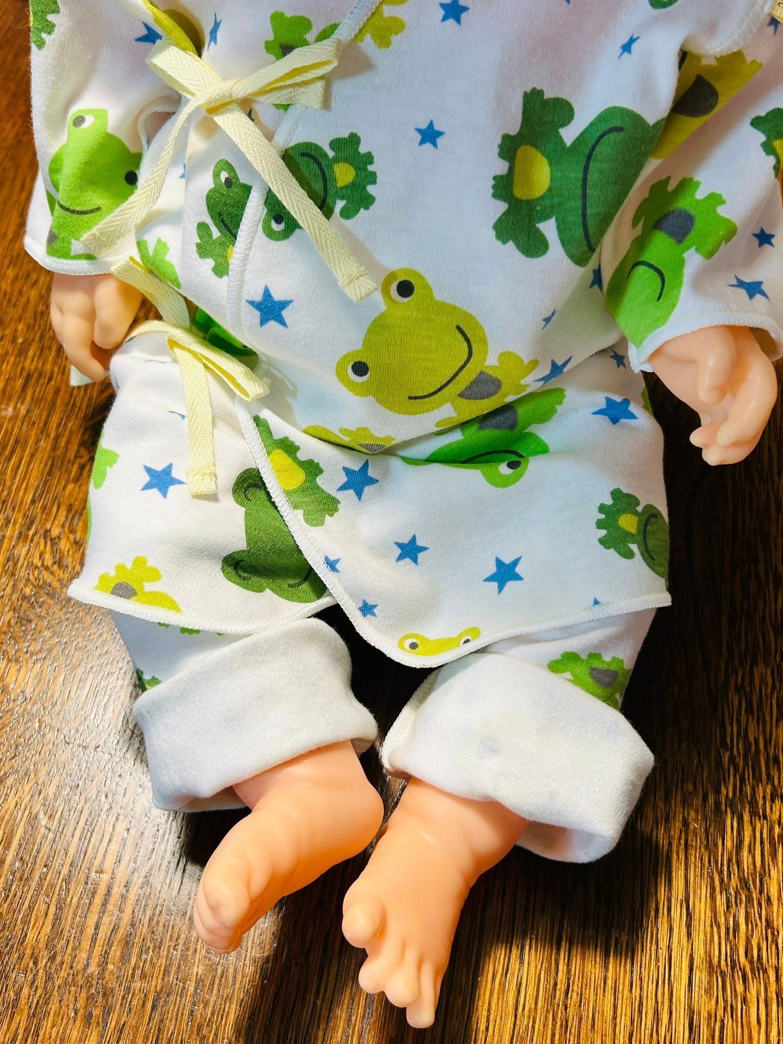 それよりも、届いてビックリ!!まるでお人形さんの洋服!?と思えるようなくらいの小ささです。でも購入したときに1300gもないくらいの娘には本当にピッタリ!!ですが、まだまた着られる大きさです。ミモザ柄も娘にはよく似合っていて購入してよかったです(*^^*)