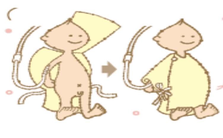 点滴や医療器具がついていても、赤ちゃんを大きく動かすことなく、お着替えができるので、生まれたばかりのまだくびのすわっていない赤ちゃんにぴったりの肌着です。